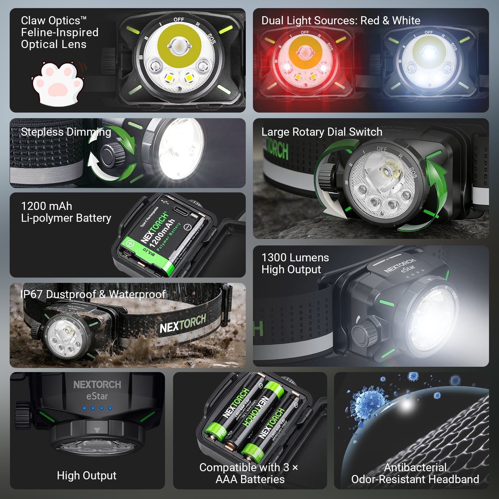 The NEXTORCH eStar is a lightweight, high-performance headlamp engineered for demanding environments. With a dual-beam output of up to 1300 lumens and multiple light modes including spot, flood, red light, and SOS, the eStar ensures optimal visibility in a wide range of tasks—from night trekking to emergency response.