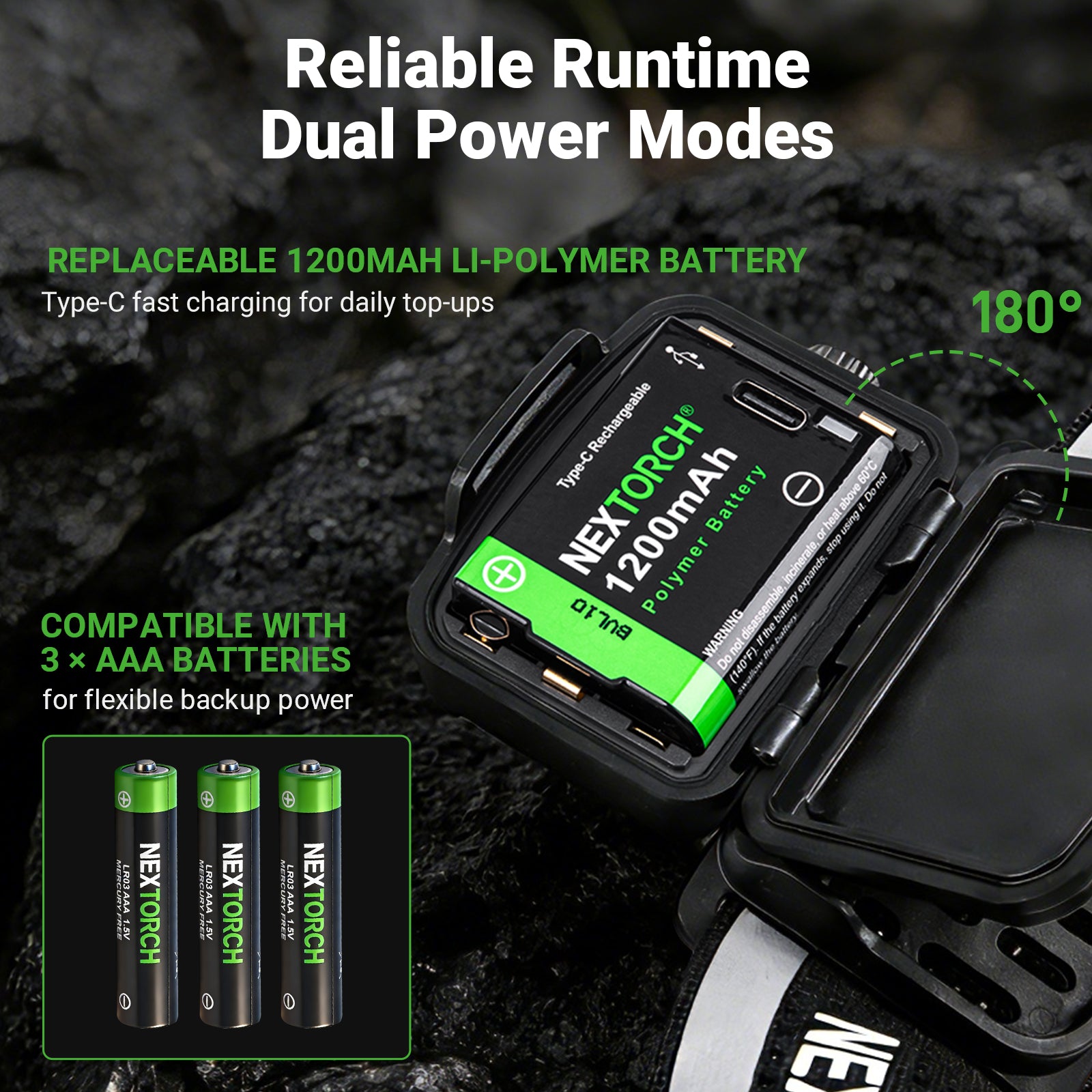 The black rechargeable model includes a 1200mAh Li-polymer battery, an additional spare battery, and is compatible with standard AAA batteries—giving you flexible power options in any situation.